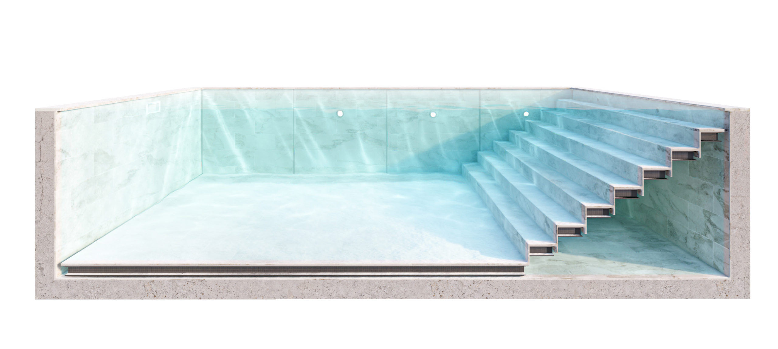 Con la nostra copertura Victoria sviluppata su misura, avrai uno spazio completamente uniforme quando la piscina è chiusa. Tuttavia, quando si scende dalla piattaforma, si formano dei gradini per accedere alla piscina. Mentre la parte rigida, non sfalsata, scende sul fondo della piscina.